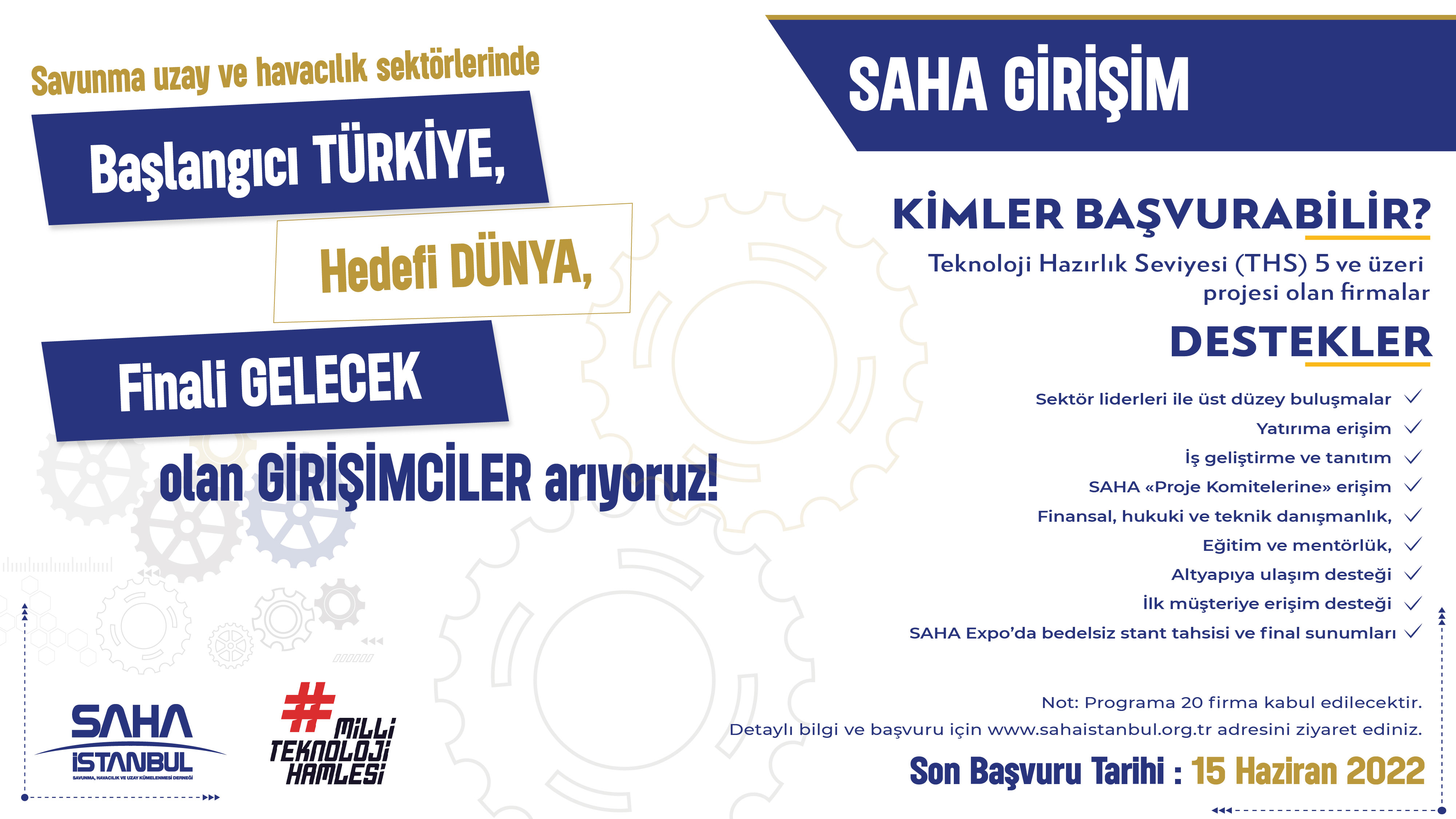 Türk savunma, havacılık ve uzay sektörünün, yerlilik oranının arttırılması, henüz sahip olmadığı kritik teknolojilere kavuşturulması ve uluslararası rekabette üst seviyelere taşınması amaçlarıyla ilk dönem çağrısına çıkan SAHA Girişim programı ile yüksek teknoloji projesi olan girişimci firmalar desteklenecektir. Hukuki ve teknik danışmanlık, eğitim ve mentörlük, altyapı desteği başta olmak üzere verilen destekler çerçevesinde SAHA İstanbul ekosisteminin gücüyle bitlikte girişimciler yatırımcı görüşmelerine hazırlanacaklar.